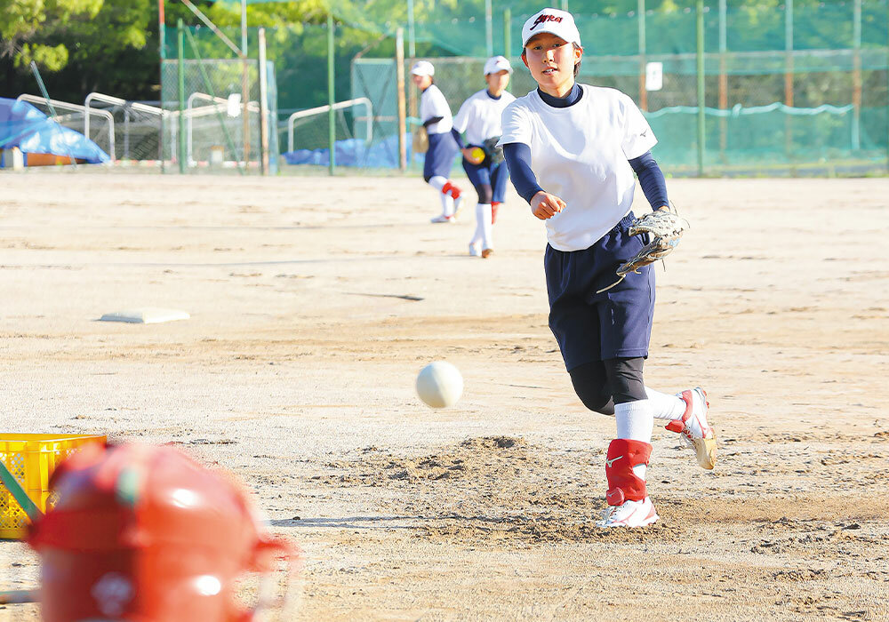 「心」を部のモットーに掲げ技術の向上だけでなく、礼儀やコミュニケーション能力の向上など、人として大きく育つことを第一の目標として取り組んでいます。中・高あわせると、初心者から小学校からの経験者までさまざまな選手が在籍しています。共通しているのは運動大好き、ソフトボールが大好きということです。
