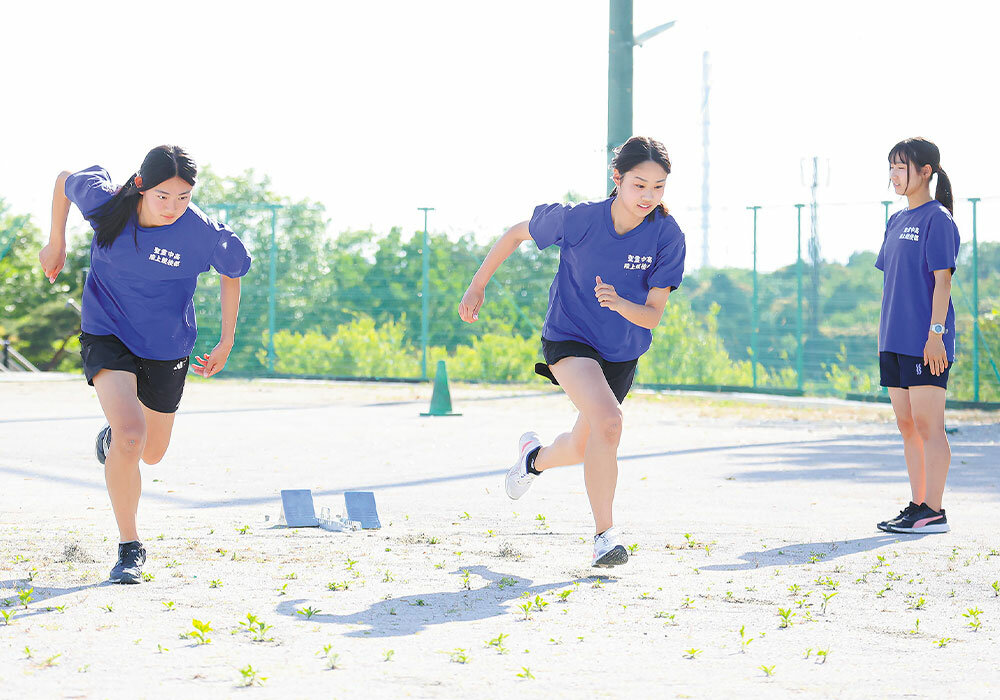 中・高合同で練習をしています。最大の目標である自己ベストの更新をめざして、日々トレーニングに励んでいます。練習するときは集中して取り組み、それ以外の部分では和気あいあいとしていることもあり、メリハリのある部活動になっています。厳しい練習でも仲間とともに協力し合いながら取り組んでいきます。そして、それを乗り越えることによって自己ベストにつながり、達成感を得ることもできます。ぜひ、聖霊陸上部で一緒に走りましょう。