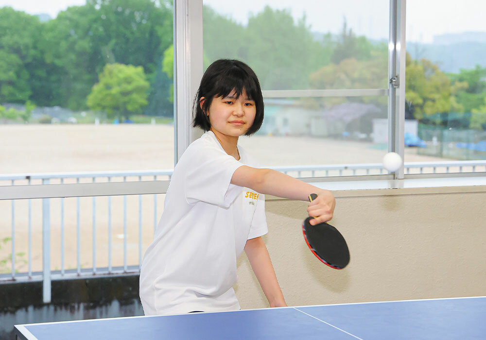 団体戦を中心とした大会に出場します。中学1年生から高校3年生まで、中・高合同で活動しています。大会に出場した際には、各自が次の大会までに克服する課題を決め、普段の練習ではそれを念頭に技術の向上に努めます。活動日は月曜日・水曜日・金曜日で、活動場所は第2体育館2階です。経験者はもちろんのこと、未経験者でも先輩たちが一から丁寧に教えてくれるので、安心して入部してください。みんなと仲良く楽しく練習に励むことができる人をお待ちしています。